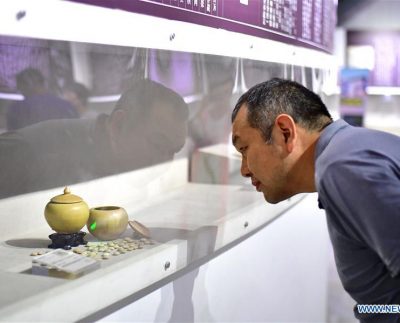 A man looks at pots filling with Go pieces at Go (Weiqi) museum in Luoyang, central China’s Henan Province, Sept.…