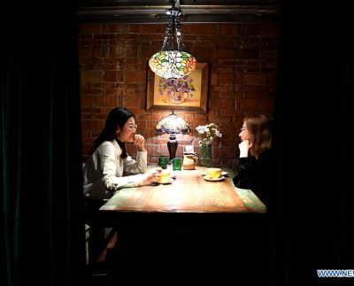 Tourists chat at a coffee bar reconstructed on the site of an idled plant at the Tianxin cultural and arts…