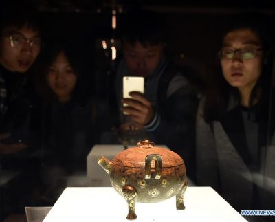 People watch an exhibit at Luoyang Museum in Luoyang City, central China’s Henan Province, April 6, 2018, during the three-day…